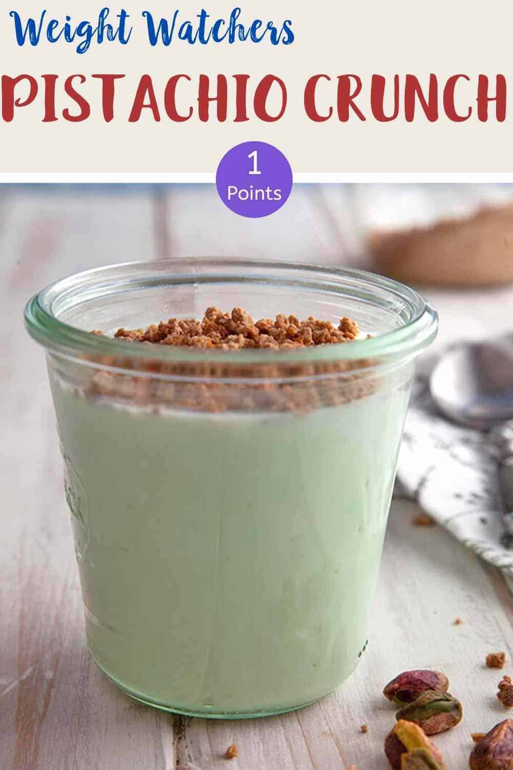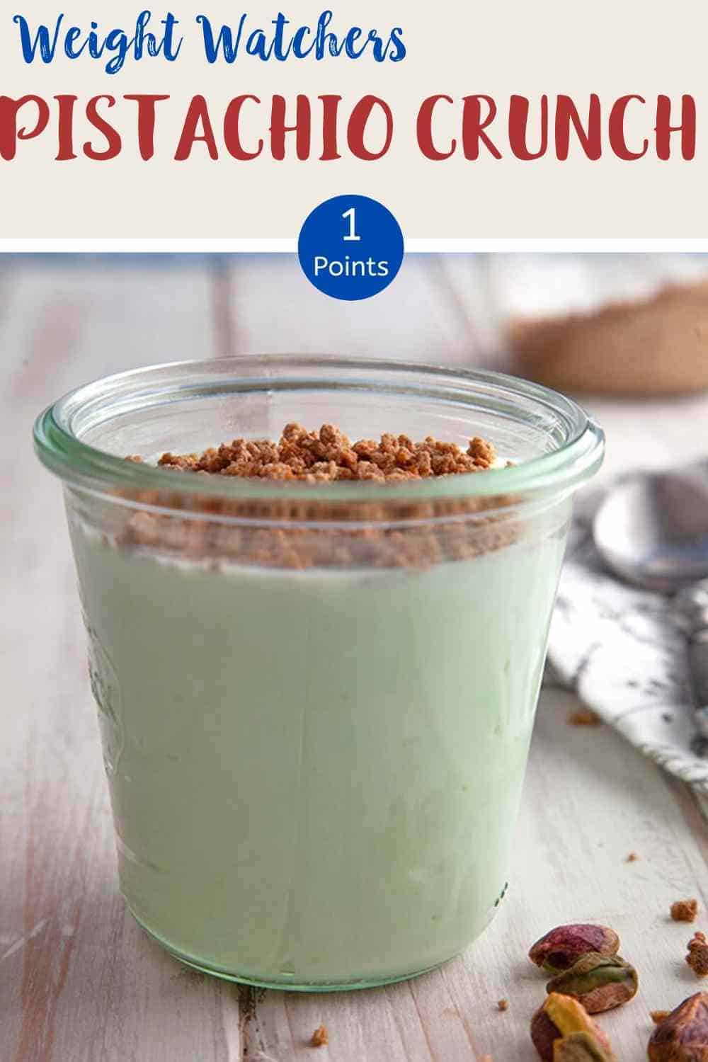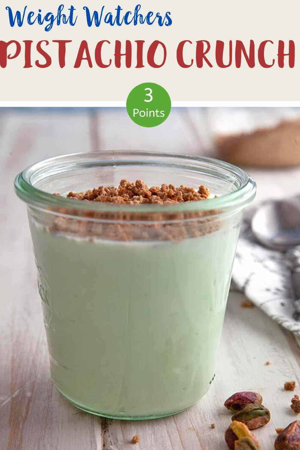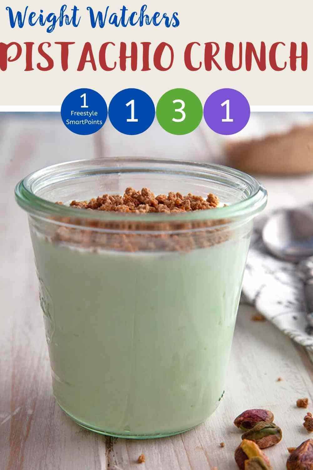 This 3 ingredient Pistachio Crunch is just 1 Smart Point per portion on Weight Watchers Freestyle plan, myWW Blue plan & myWW Purple plan. It is 3 SmartPoints per portion on the myWW Green plan. A tasty and satisfying low point dessert!